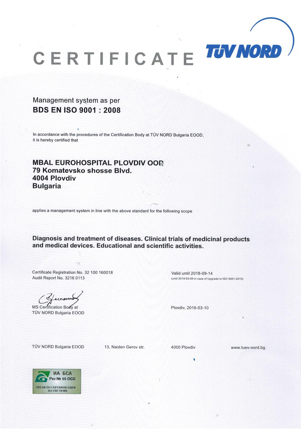 В днешния свят придържането към ясно дефинирани стандарти за качество е все по-важно. ISO 9001 e най-популярният и широко разпространен международен стандарт, поставящ изисквания към системите за управление. Целта е непрекъснато да се подобряват процесите и услугите в една организация, за да се задоволят изискванията на клиентите. УМБАЛ „Еврохоспитал“ е сертифицирана по ISO 9001, което гарантира на пациентите, че услугата, която им предоставя лечебното заведение отговаря на всички изисквания на системата за управление на качеството. Лидерство, приобщаване на персонала, насоченост към клиента, управление на взаимоотношенията, вземане на решения, основани на доказателства – това са само част от основните принципи, на които се основава този стандарт. Освен повишения фирмен имидж, ползите от внедряването на ISO 9001 са свързани с непрекъснатото доставяне на стоки и услуги, които съответстват на изискванията на клиента и повишават неговата удовлетвореност, както и постоянното повишаване на компетентността на персонала.